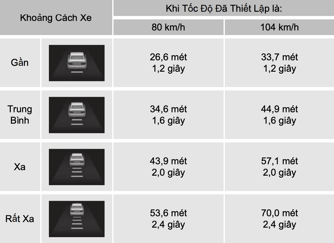 ![]() | Khi sử dụng hệ thống Kiểm soát hành trình thích ứng (ACC) cùng chế độ Low Speed Follow, bạn có thể tùy chỉnh khoảng cách với xe phía trước bằng cách nhấn nút khoảng cách trên vô-lăng. Mỗi lần nhấn, hệ thống sẽ thay đổi mức khoảng cách theo thứ tự: rất xa → xa → trung bình → gần, giúp người lái dễ dàng lựa chọn khoảng cách phù hợp với điều kiện giao thông và phong cách lái xe. |